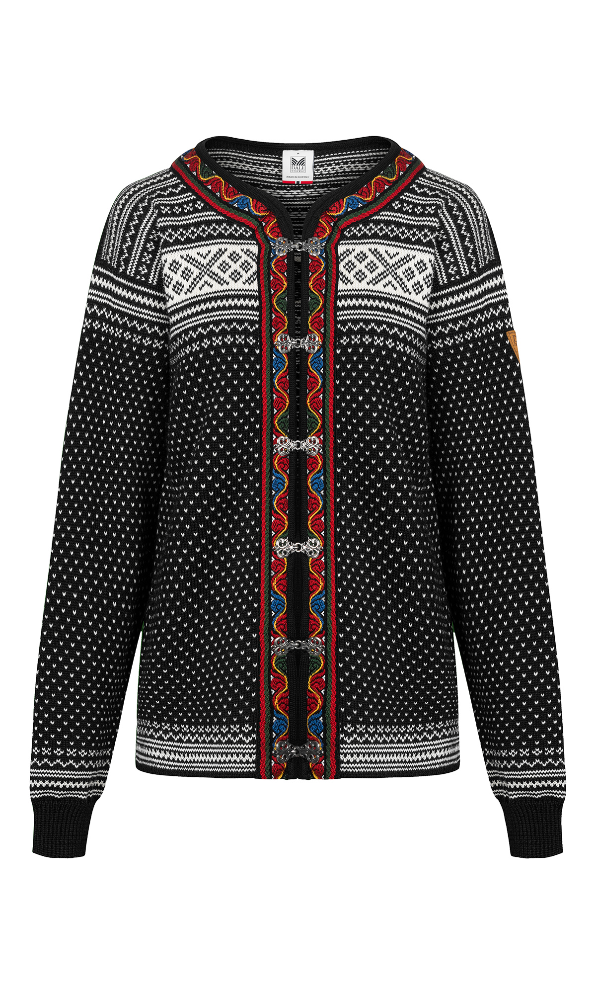 The Setesdal design is Norway’s most famous pattern. This is the original "lusekofte," knitted in 100% wool, with Norwegian-made pewter clasps and woven bands, identical to the original design. The wool jacket features the well-known "luse" pattern and traditional crosses, which were originally knitted in to protect against evil spirits.